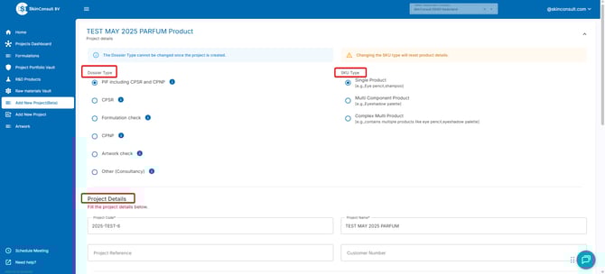 Dossier Type, SKU Type & Project Details (Project Code and Project Name.)
