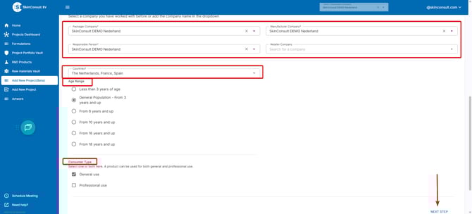 Scroll down and fill in what companies are involved, in what countries the product(-s) will be sold as well as the Age Range and Consumer Type.