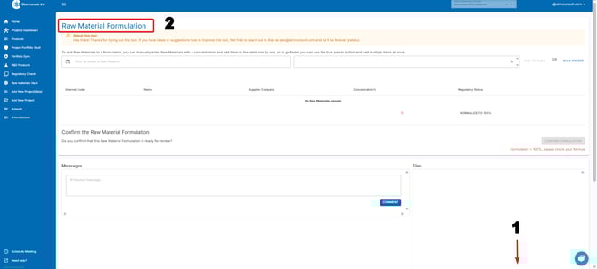 - 1. Scroll down in the bottom right corner and, click DROP OR CLICK TO ADD FILES & upload a Raw Material Formula file.
