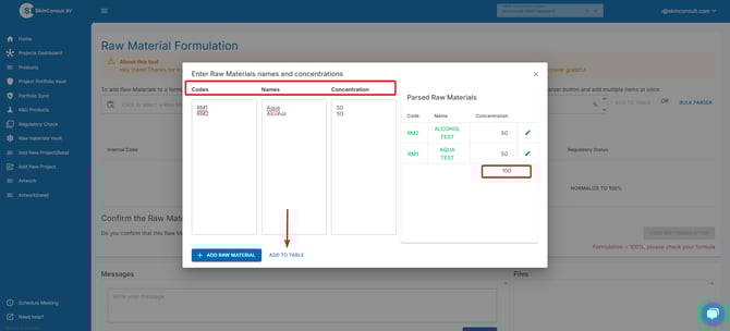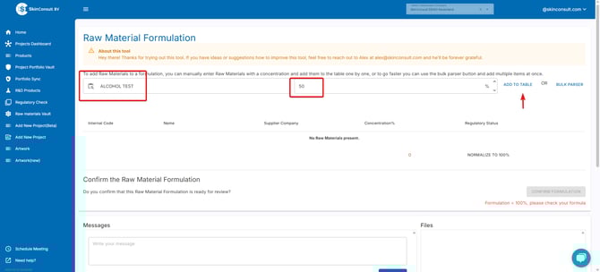 next up, add how many % that Raw Material makes up in the formula and click ADD TO TABLE.