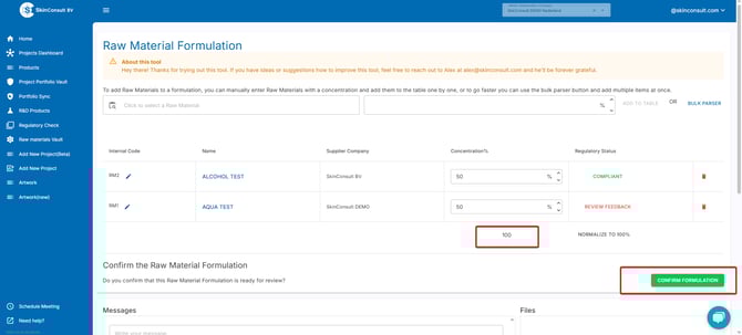 When you are content with the Raw Material Formula, click CONFIRM FORMULATION.