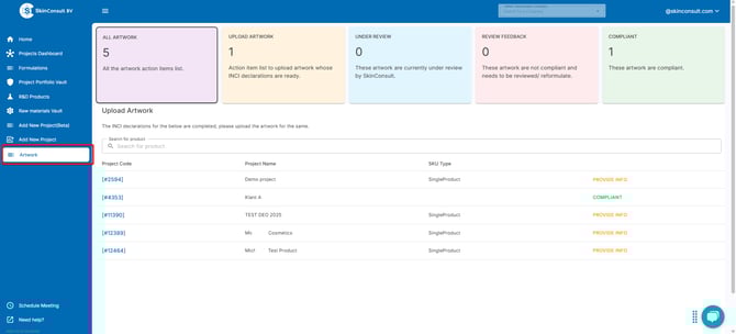 Go to the SkinApp. In the left index, select Artwork. Alternatively, navigate directly to this page using the following link: https://app.skinconsult.com/artwork