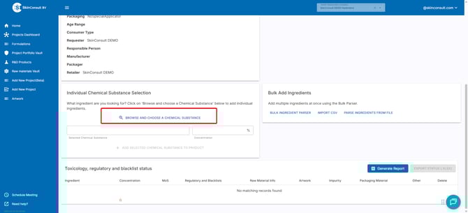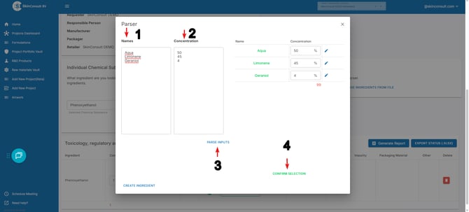 2. Add the chemical substance Names (1), the Concentration (2) and then press PARSE INPUTS (3) and lastly click CONFIRMSELECTION (4) to add the ingredients to your product.