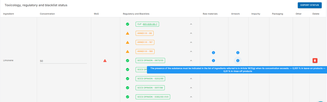 If the product does not comply with an annex or blacklist, red entries will appear with information why it is not compliant