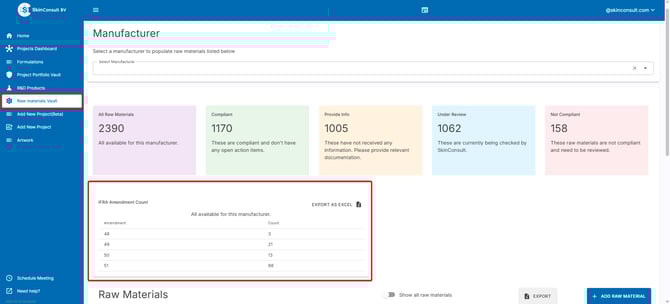 You can easily click the EXPORT AS EXCEL button to get an Excel file of all the Raw Materials that need their IFRA statements updated.