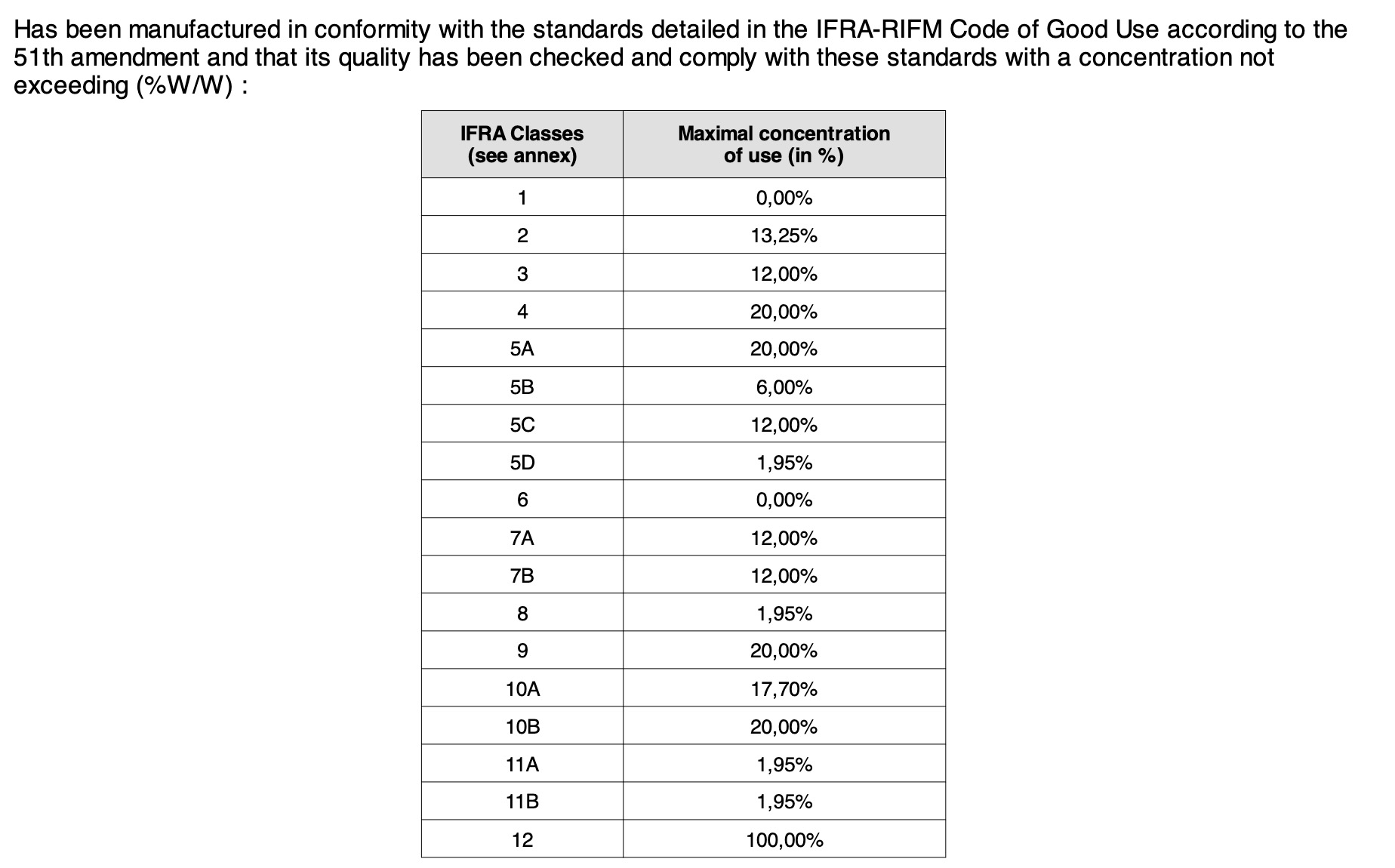 IFRA statements are documents provided by perfume and essential oil suppliers which indicate how much their raw material can be present in the final product.